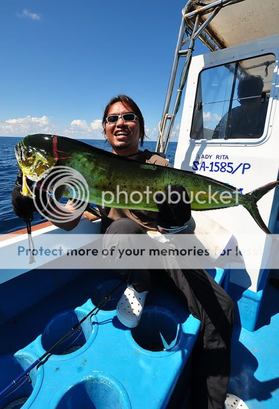 After that incident which reminded us how dangerous it can be on the water, we then continued trolling around the FADs. Then there was another strike on the Halco, and Akashah pulled in a smallish mahi-mahi which was certainly punching above its weight in the pulling stakes.